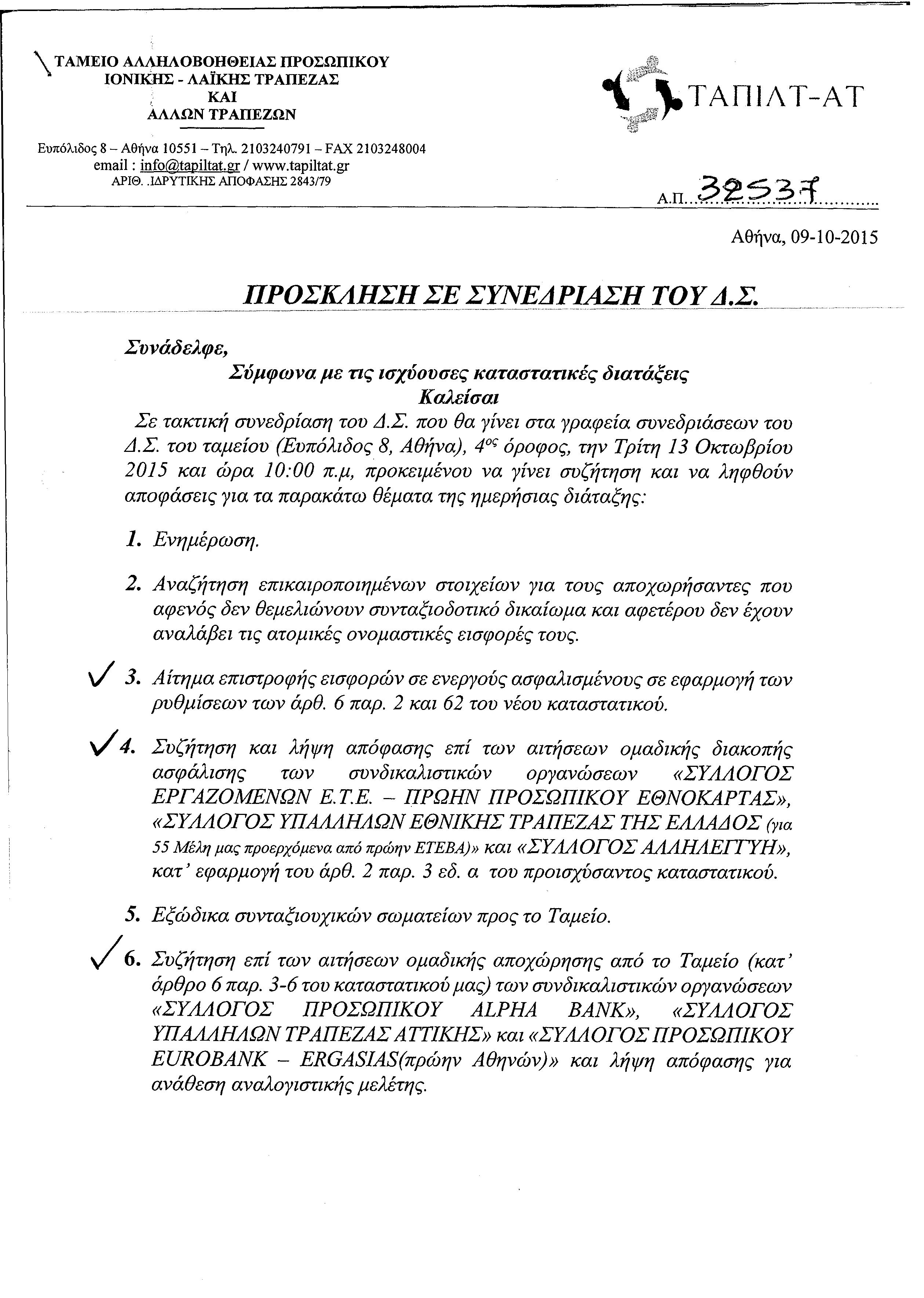 Όπως γνωρίζετε το Δ.Σ. του ΤΑΠΙΛΤ-ΑΤ στη συνεδρίασή του της 13ης Οκτωβρίου 2015 εξέτασε το αίτημα του Συλλόγου Προσωπικού ALPHA BANK και των άλλων συλλόγων για ομαδική αποχώρηση με την ανάληψη του συνόλου εισφορών εργαζομένου και εργοδότη (3%+4%=7%) των μελών τους και αποφάσισε με πλειοψηφία 7 προς 1 την εκπόνηση ειδικής αναλογιστικής μελέτης.