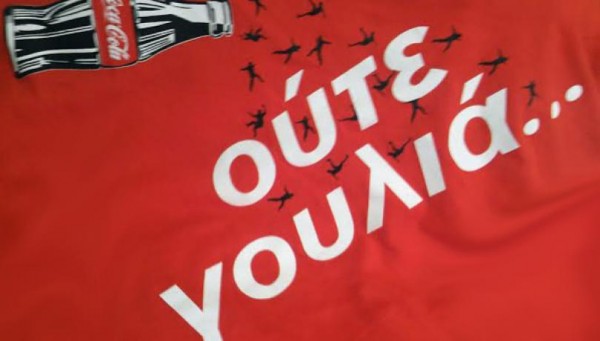 Ενώ έχει κλείσει όλα τα εργοστάσιά της στην Ελλάδα (Κέρκυρα, Μεσολόγγι, Πάτρα, Αθήνα, Ρόδος, Βόλος και Θεσσαλονίκη) αφήνοντας στο δρόμο 2.500 εργαζομένους, με μια ύπουλη τηλεοπτική διαφήμιση, προσπαθεί να «πείσει» το καταναλωτικό κοινό ότι συνεχίζει σαν και πρώτα τις δραστηριότητές της στην Ελλάδα, θέλοντας με αυτόν τον τρόπο να επισκιάσει τον αγώνα. Η Coca Cola δείχνει στη διαφήμισή της «χαρούμενους ηθοποιούς-εργάτες», τη στιγμή που το εργοστάσιο έχει κλείσει, οι εργαζόμενοι συνεχίζουν την απεργία τους με όπλο τους το «μποϊκοτάζ’ και διεκδικούν την επαναλειτουργία του και την επιστροφή τους στην εργασία τους.