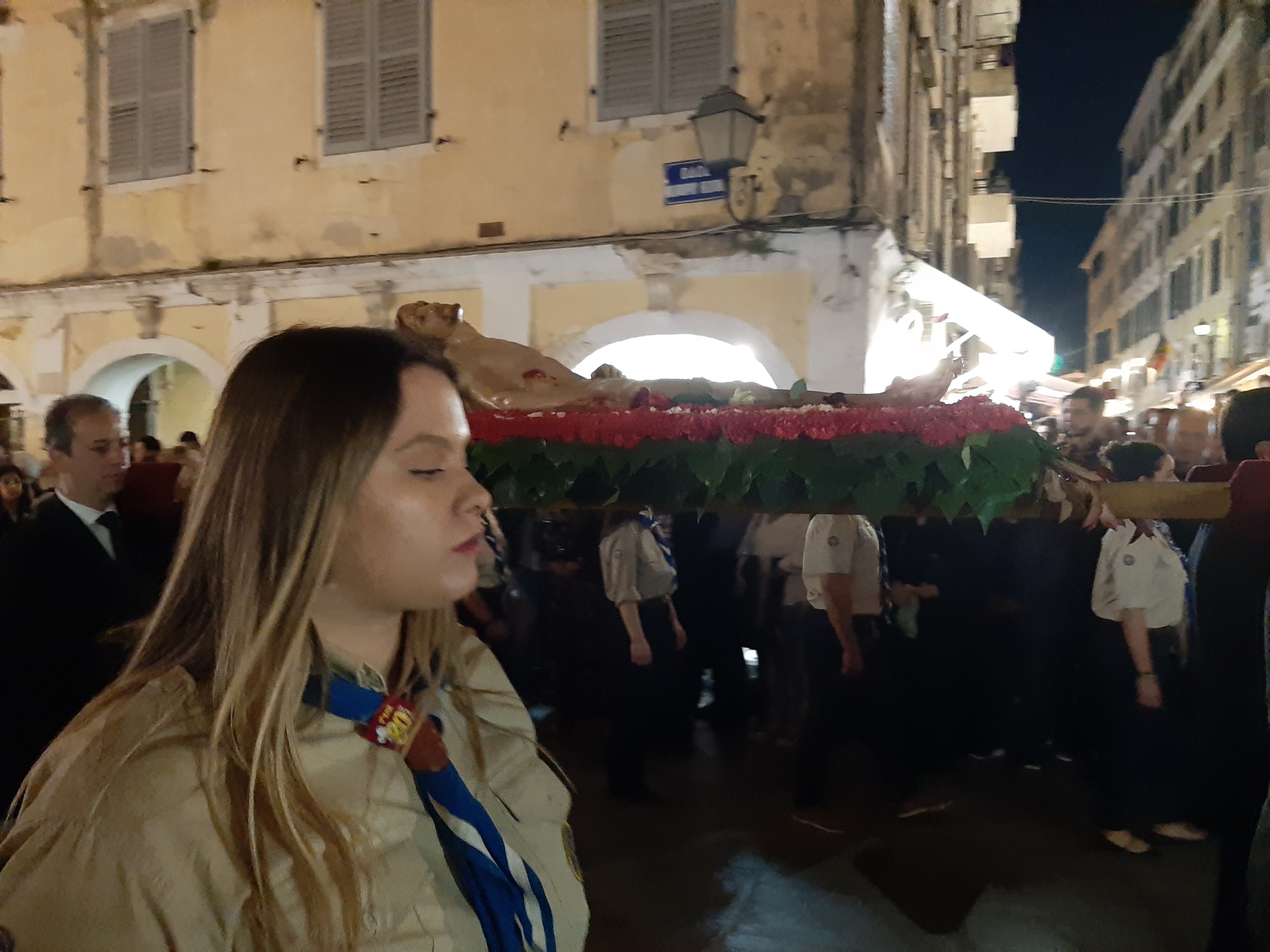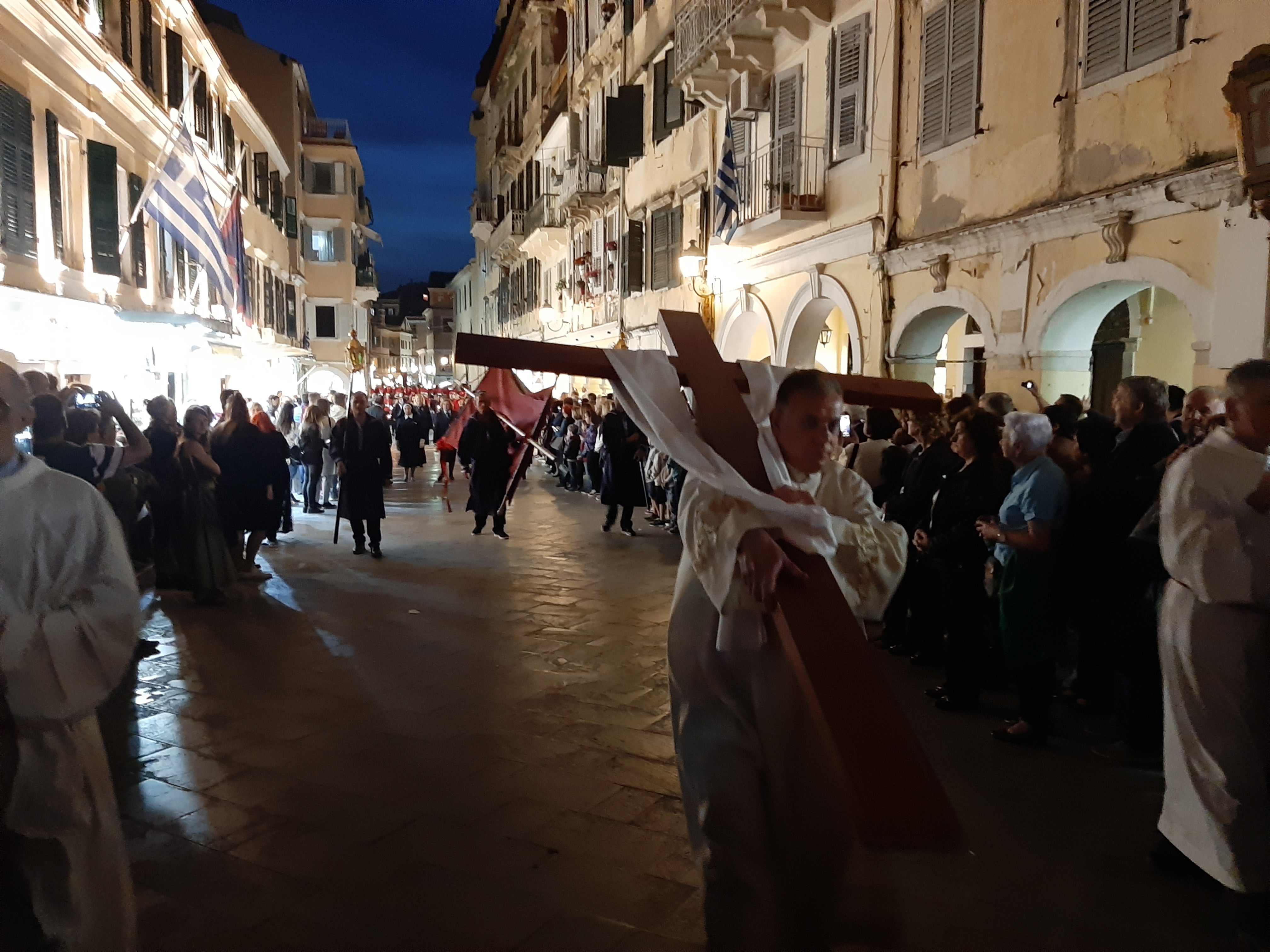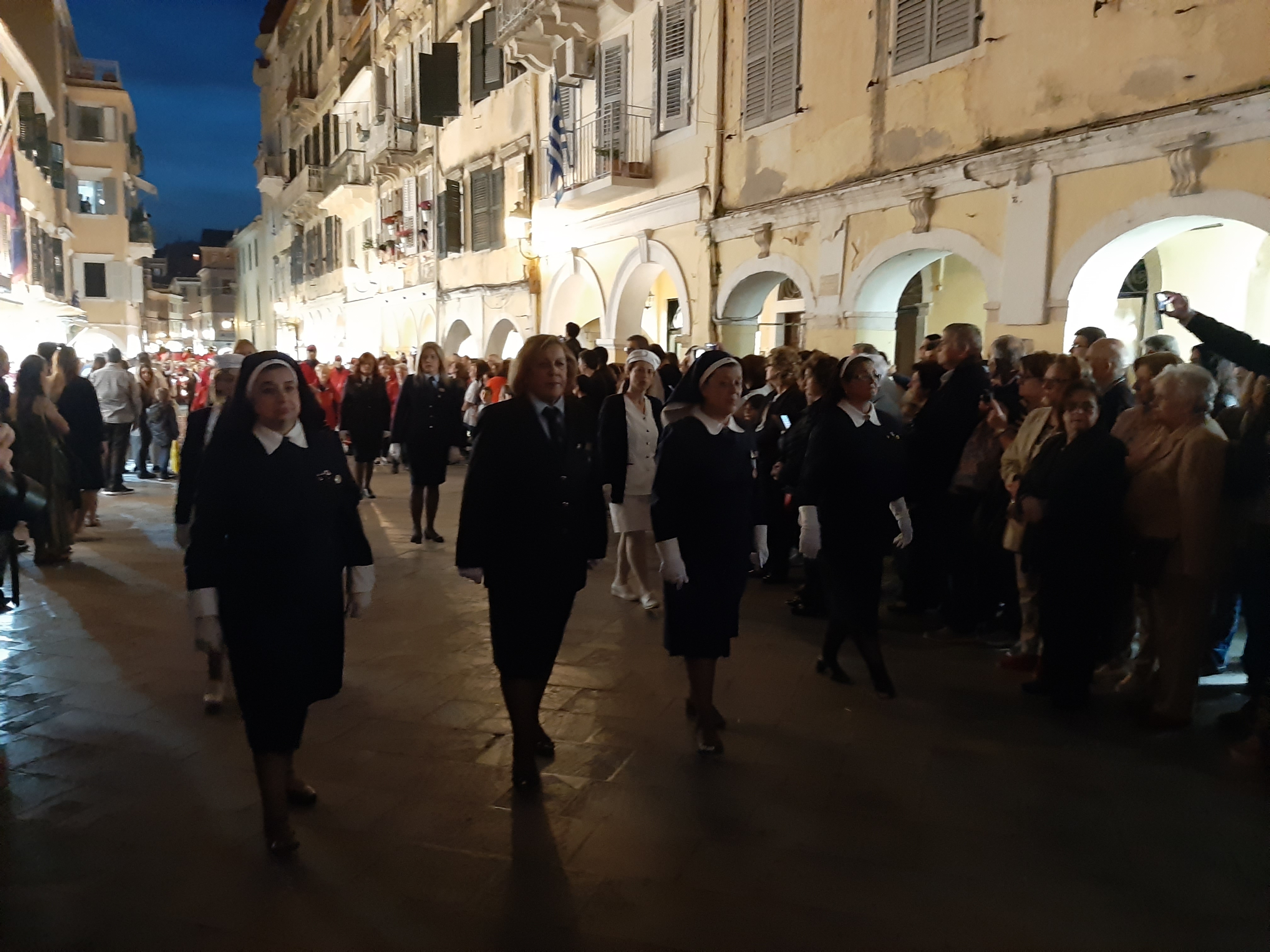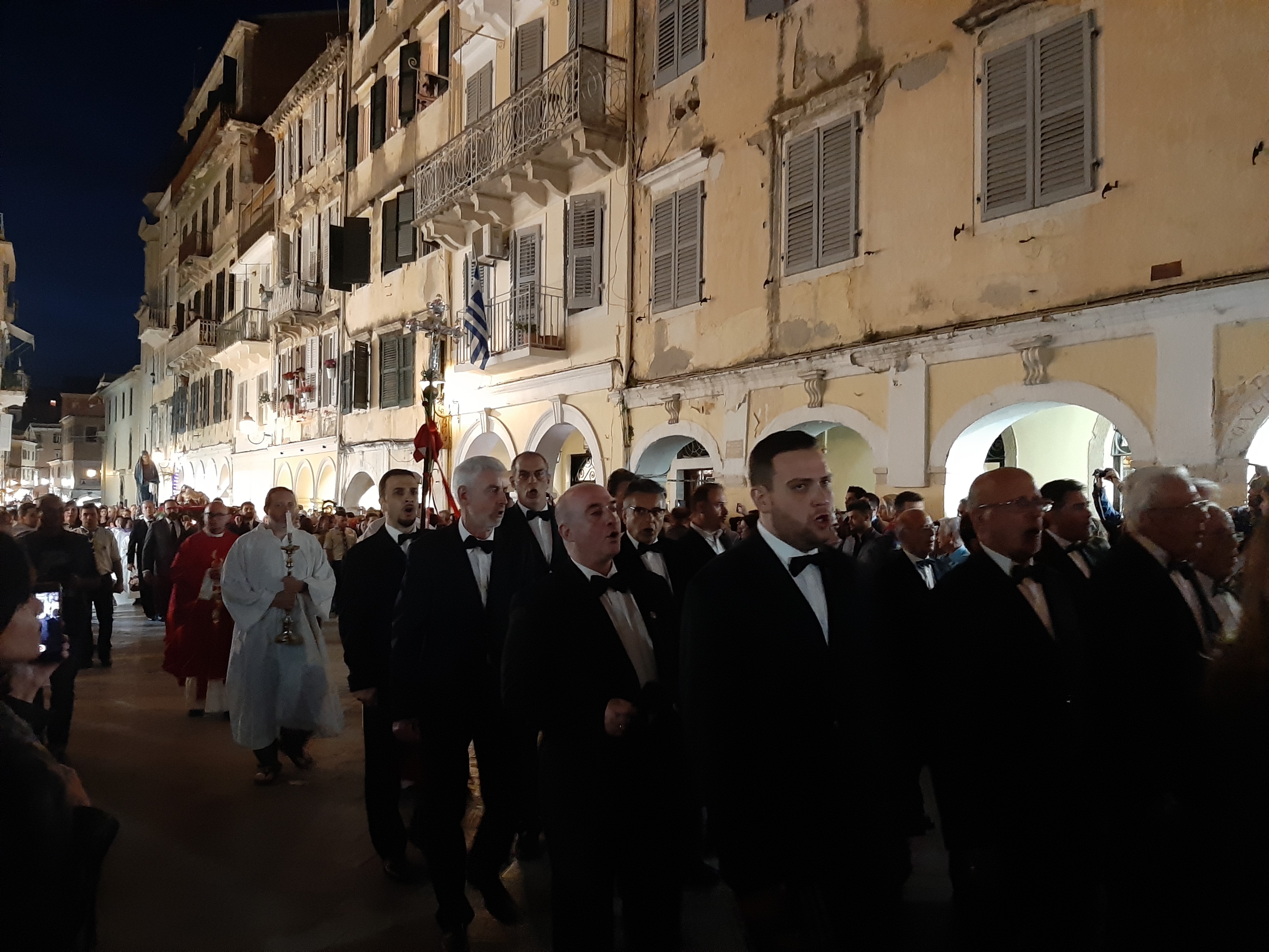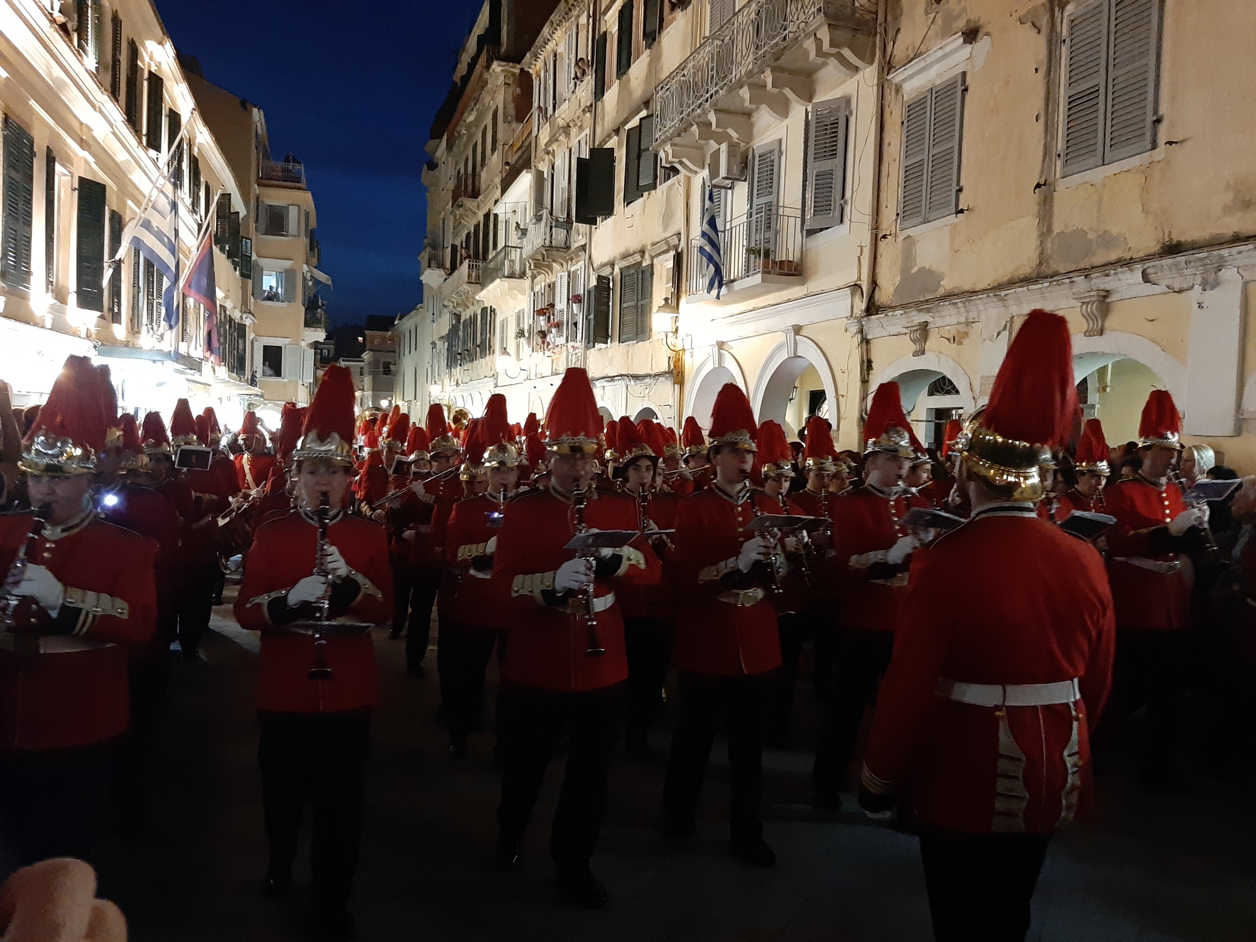 Η ώρα του μοναδικού θεάματος της πομπής των επιταφίων είχε φτάσει. Οι επιτάφιοι από τις διάφορες ενορίες της πόλης κατευθύνονται με πομπές, συνοδεία των φιλαρμονικών, προς τη Λιστόν. Ανάμεσά τους και η πομπή του επιταφίου του «διαφορετικού» καθολικού ναού που συνεορτάζει το Πάσχα στην Κέρκυρα μαζί με τους Ορθόδοξος. Μετά τις 10 μ.μ. σύσσωμες οι τρεις φιλαρμονικές σε παράταξη, με τα γυαλιστερά τους κράνη για να ξεχωρίζουν μαζί με ανδρικές και γυναικείες χορωδίες, ψέλνουν τα εγκώμια, ενώ στο μεγαλοπρεπές σκηνικό προσθέστε παρατεταγμένους μαθητές από όλα τα σχολεία της πόλης και αντιπροσωπείες κοινωνικών φορέων σε ένα εντυπωσιακό θέαμα που κρατά μέχρι και μετά τα μεσάνυχτα! Ευχαριστημένοι και πραγματικά άκρως εντυπωσιασμένοι από τα δρώμενα της Μεγάλης Παρασκευής, αλλά και κουρασμένοι από τις δραστηριότητες της ημέρας, γυρίσαμε στο ξενοδοχείο μας.