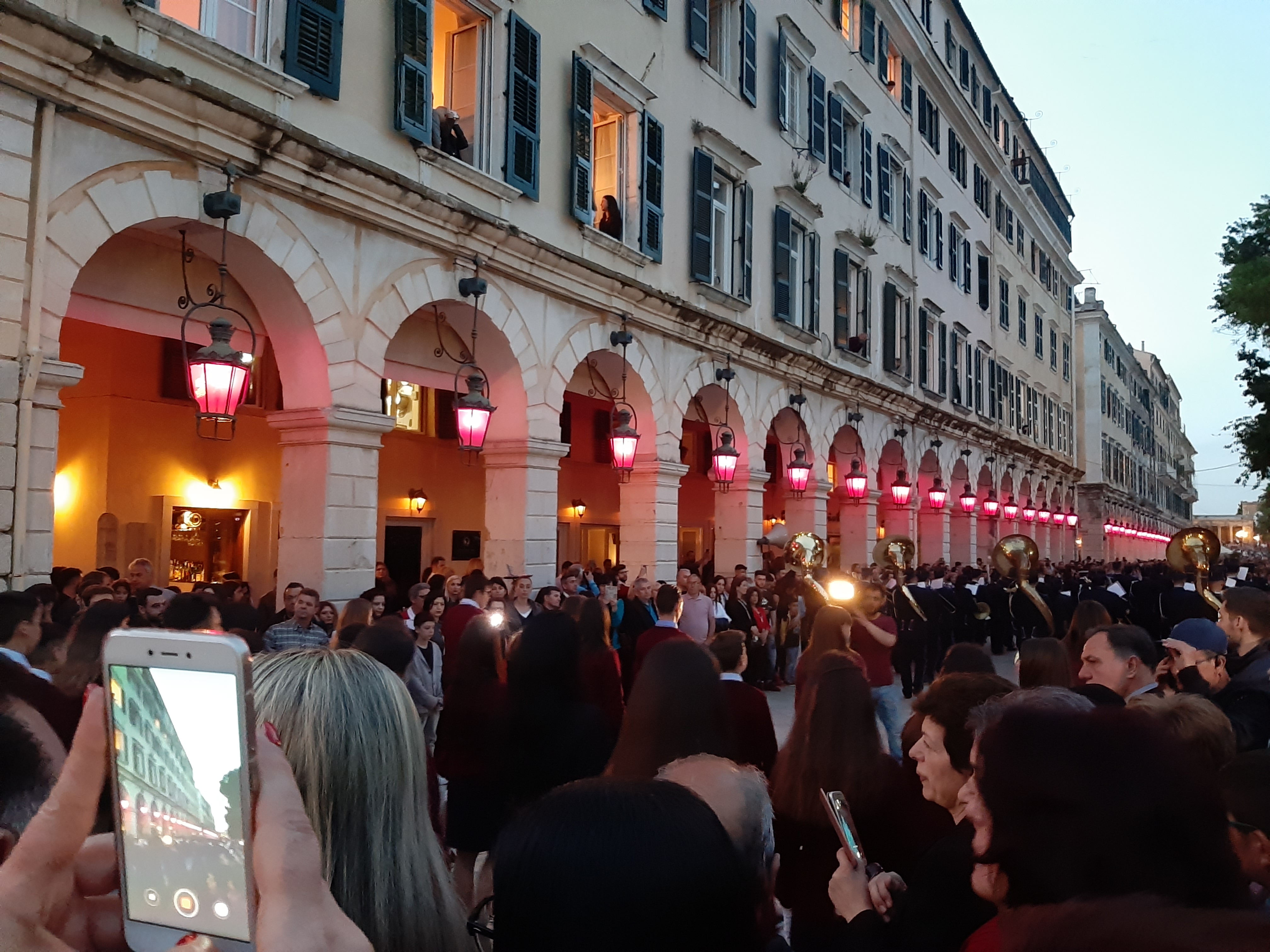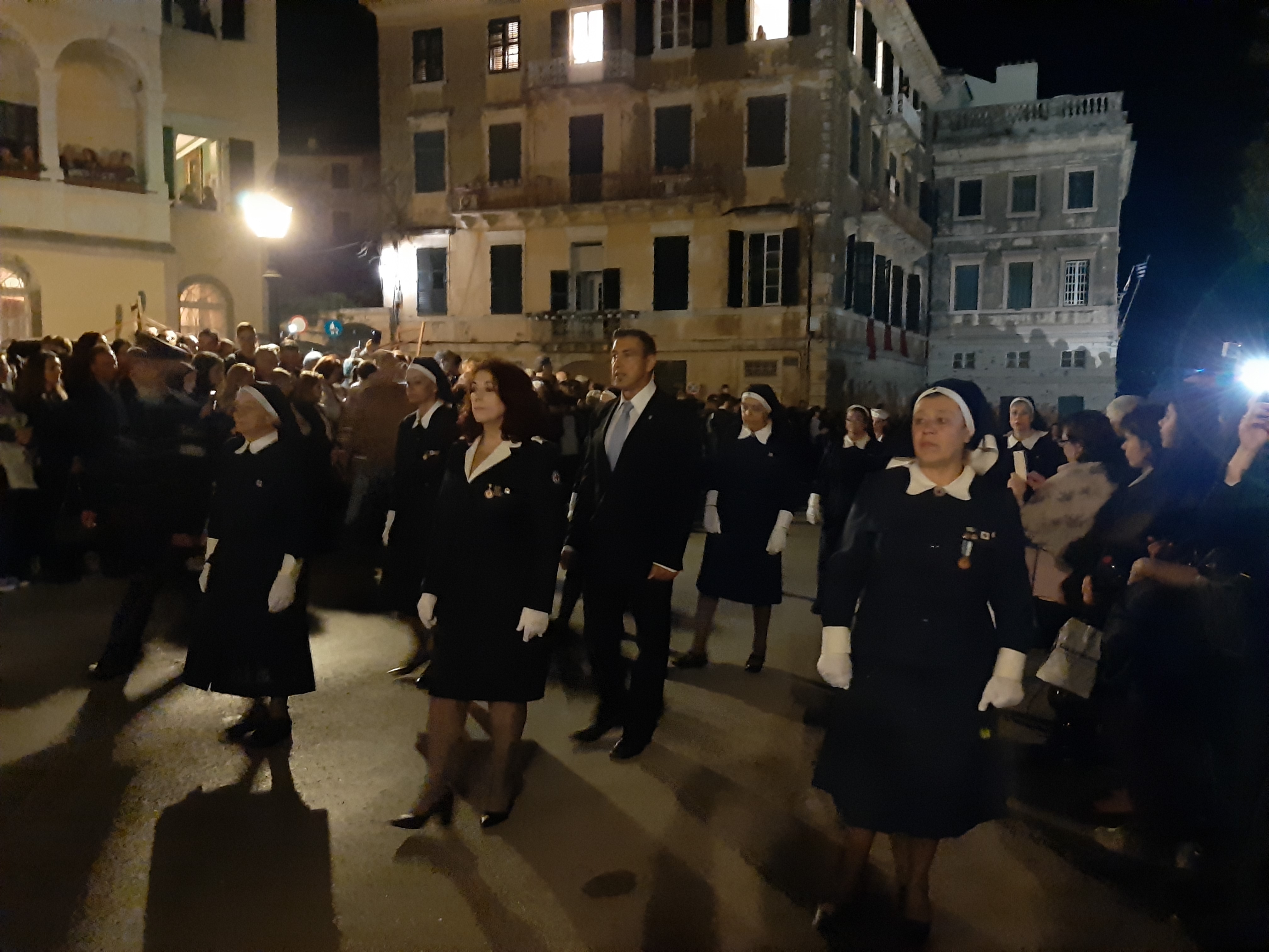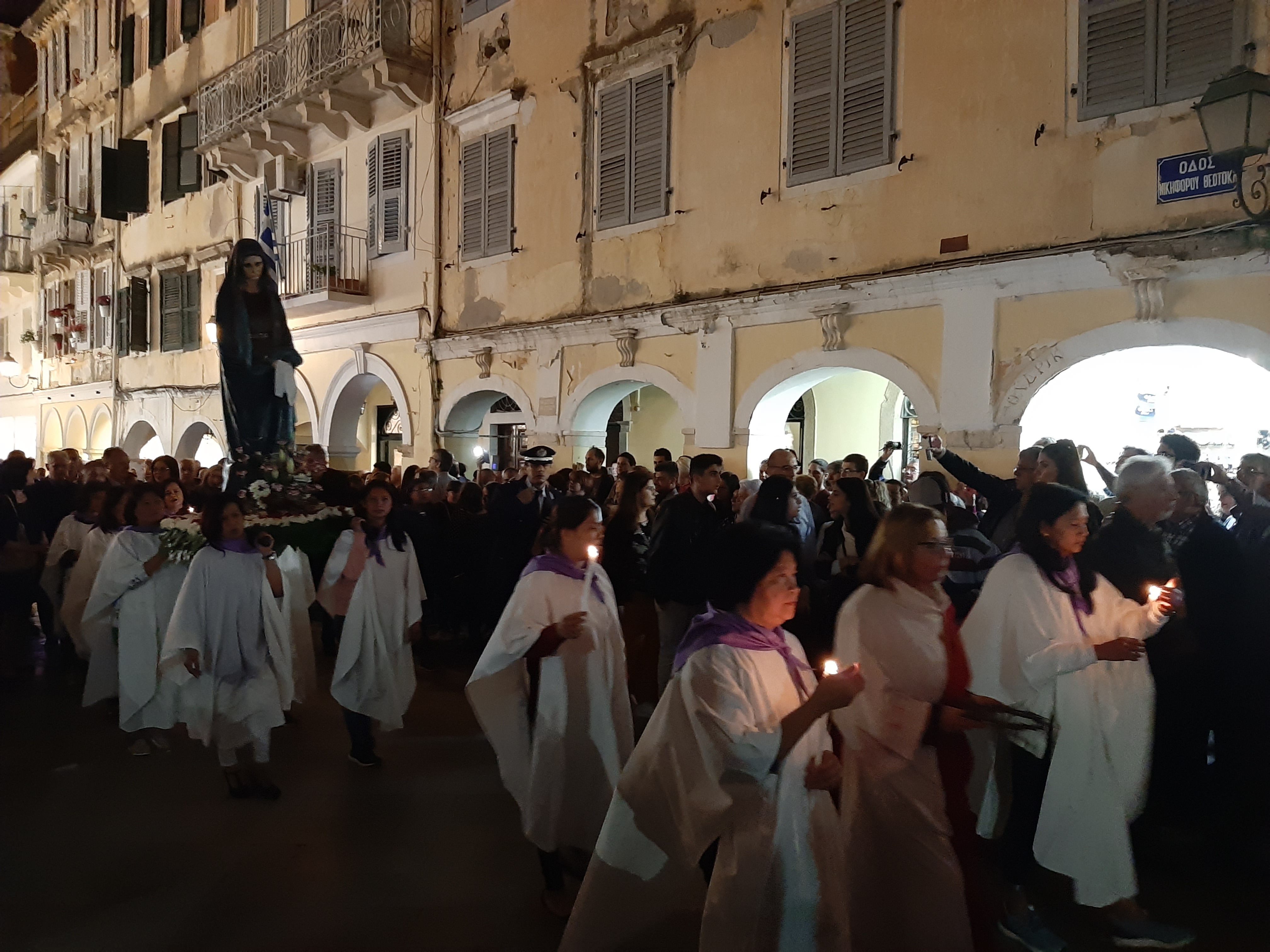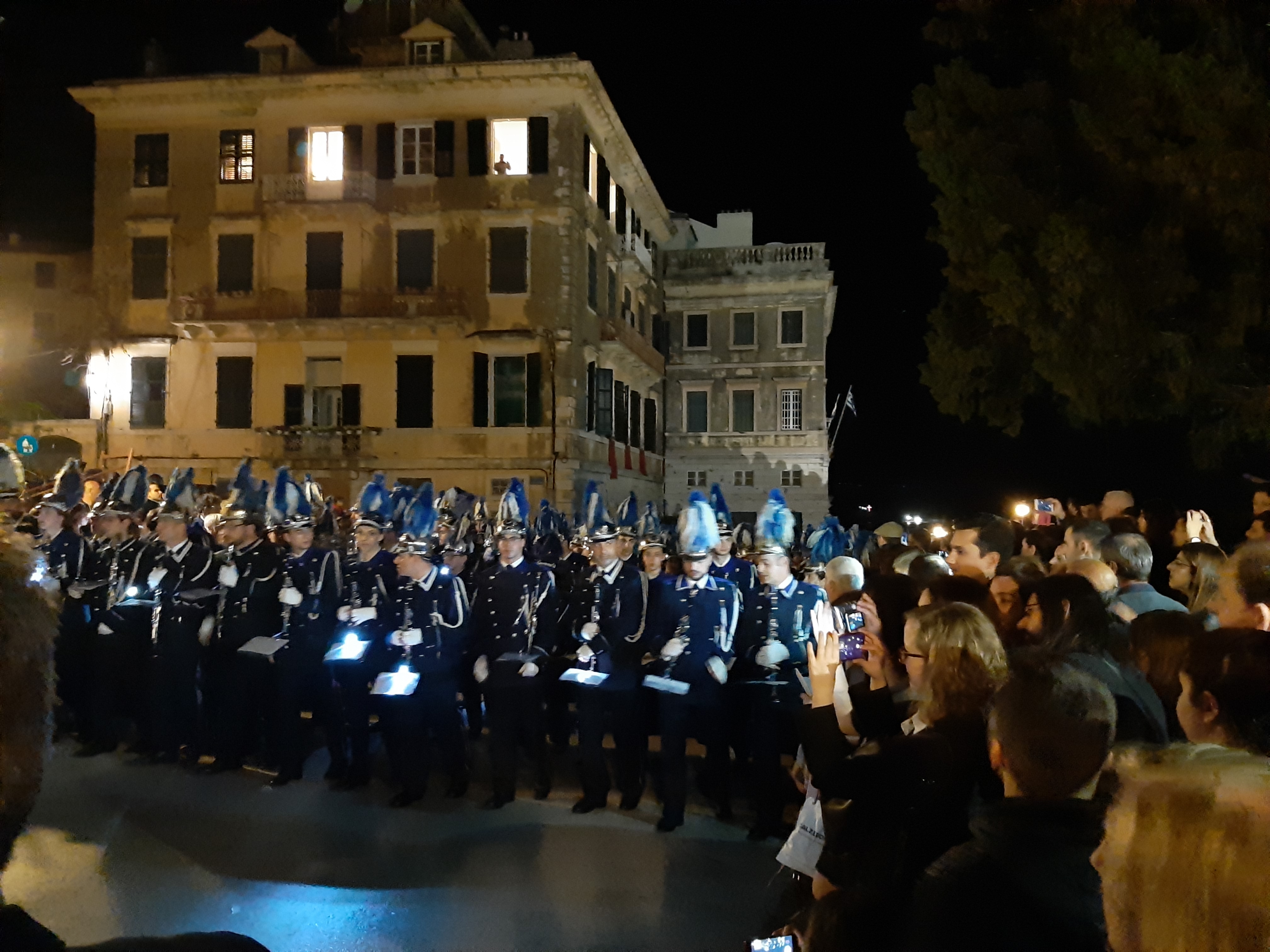 Η ώρα του μοναδικού θεάματος της πομπής των επιταφίων είχε φτάσει. Οι επιτάφιοι από τις διάφορες ενορίες της πόλης κατευθύνονται με πομπές, συνοδεία των φιλαρμονικών, προς τη Λιστόν. Ανάμεσά τους και η πομπή του επιταφίου του «διαφορετικού» καθολικού ναού που συνεορτάζει το Πάσχα στην Κέρκυρα μαζί με τους Ορθόδοξος. Μετά τις 10 μ.μ. σύσσωμες οι τρεις φιλαρμονικές σε παράταξη, με τα γυαλιστερά τους κράνη για να ξεχωρίζουν μαζί με ανδρικές και γυναικείες χορωδίες, ψέλνουν τα εγκώμια, ενώ στο μεγαλοπρεπές σκηνικό προσθέστε παρατεταγμένους μαθητές από όλα τα σχολεία της πόλης και αντιπροσωπείες κοινωνικών φορέων σε ένα εντυπωσιακό θέαμα που κρατά μέχρι και μετά τα μεσάνυχτα! Ευχαριστημένοι και πραγματικά άκρως εντυπωσιασμένοι από τα δρώμενα της Μεγάλης Παρασκευής, αλλά και κουρασμένοι από τις δραστηριότητες της ημέρας, γυρίσαμε στο ξενοδοχείο μας.