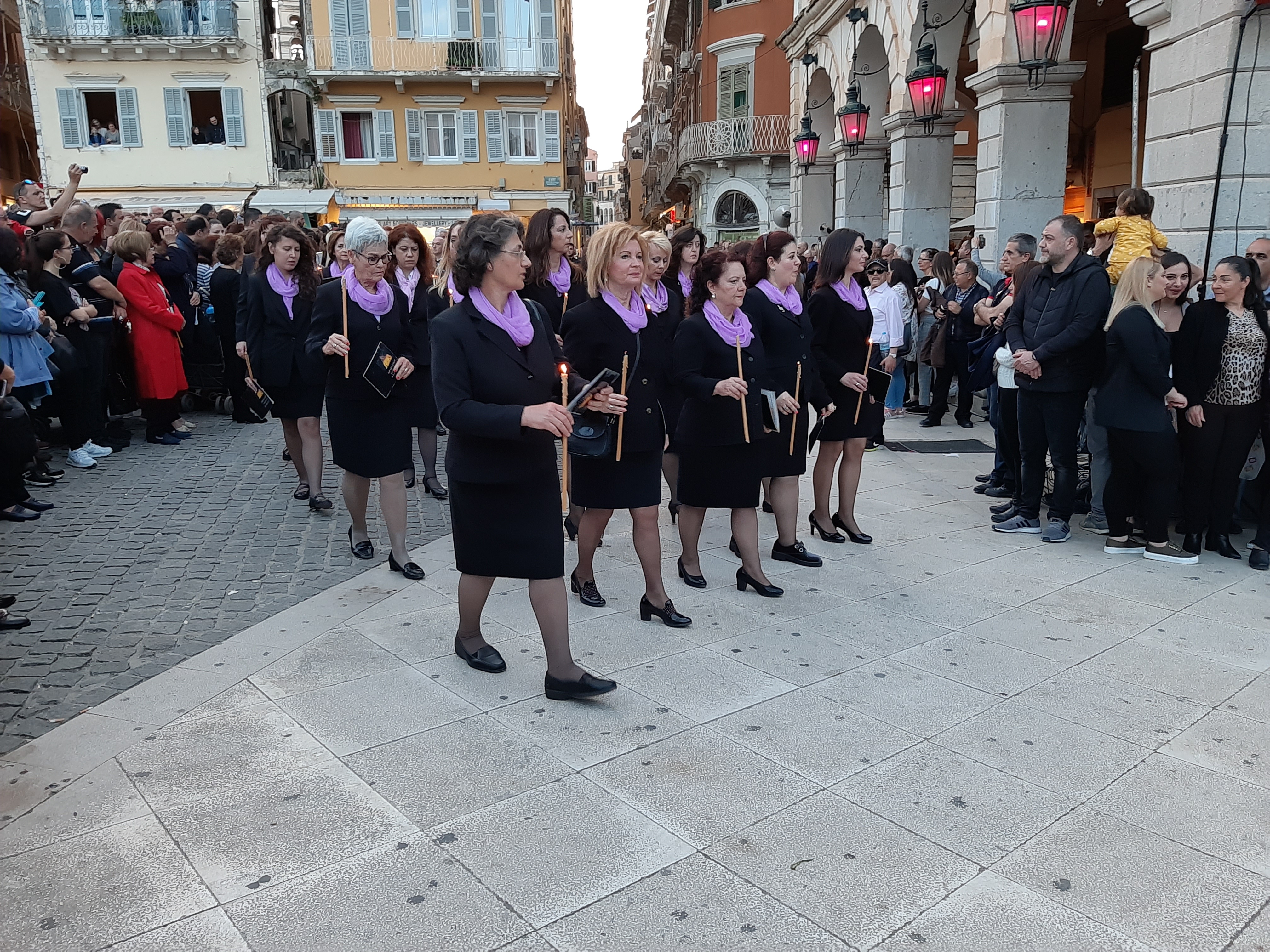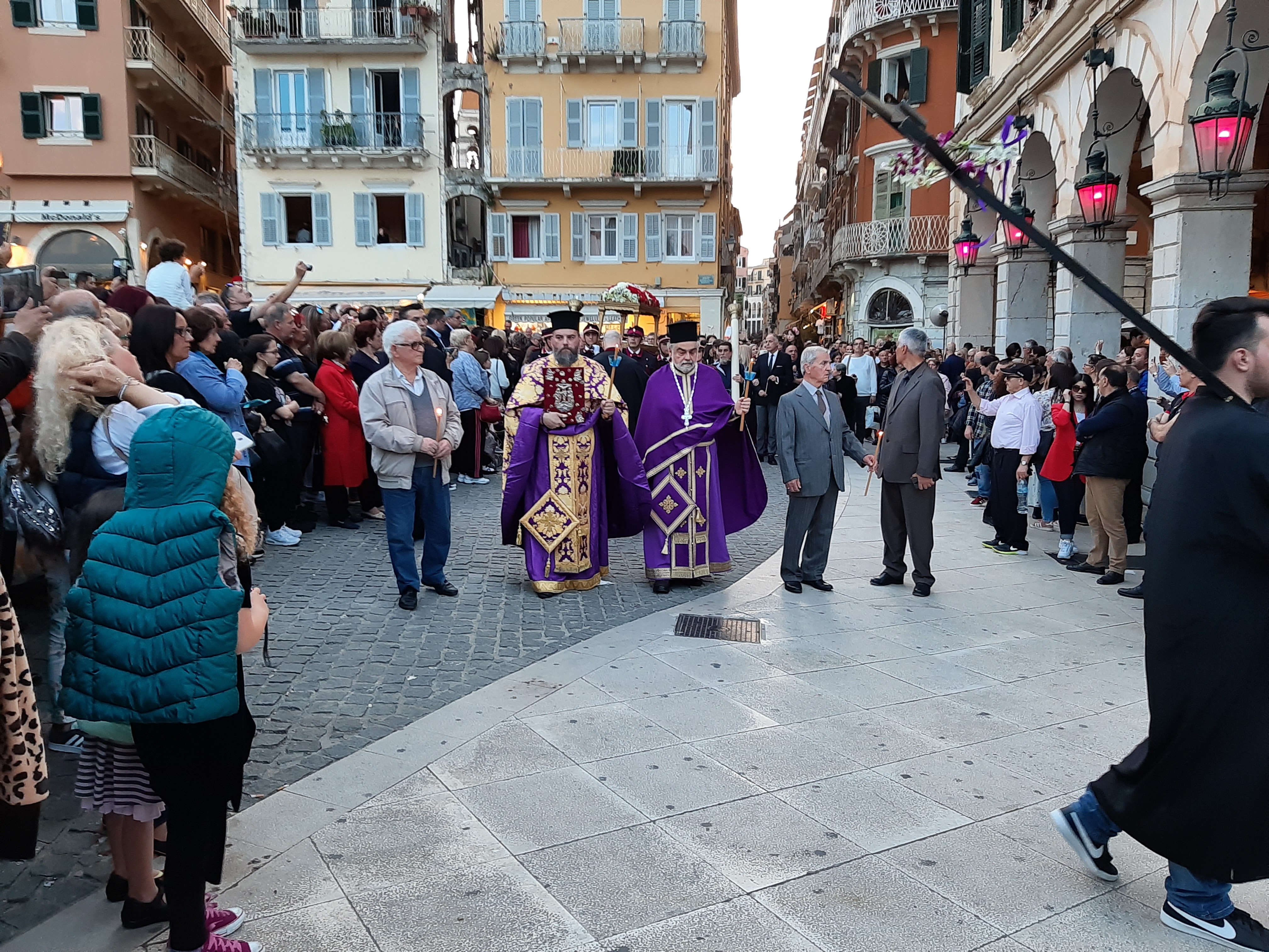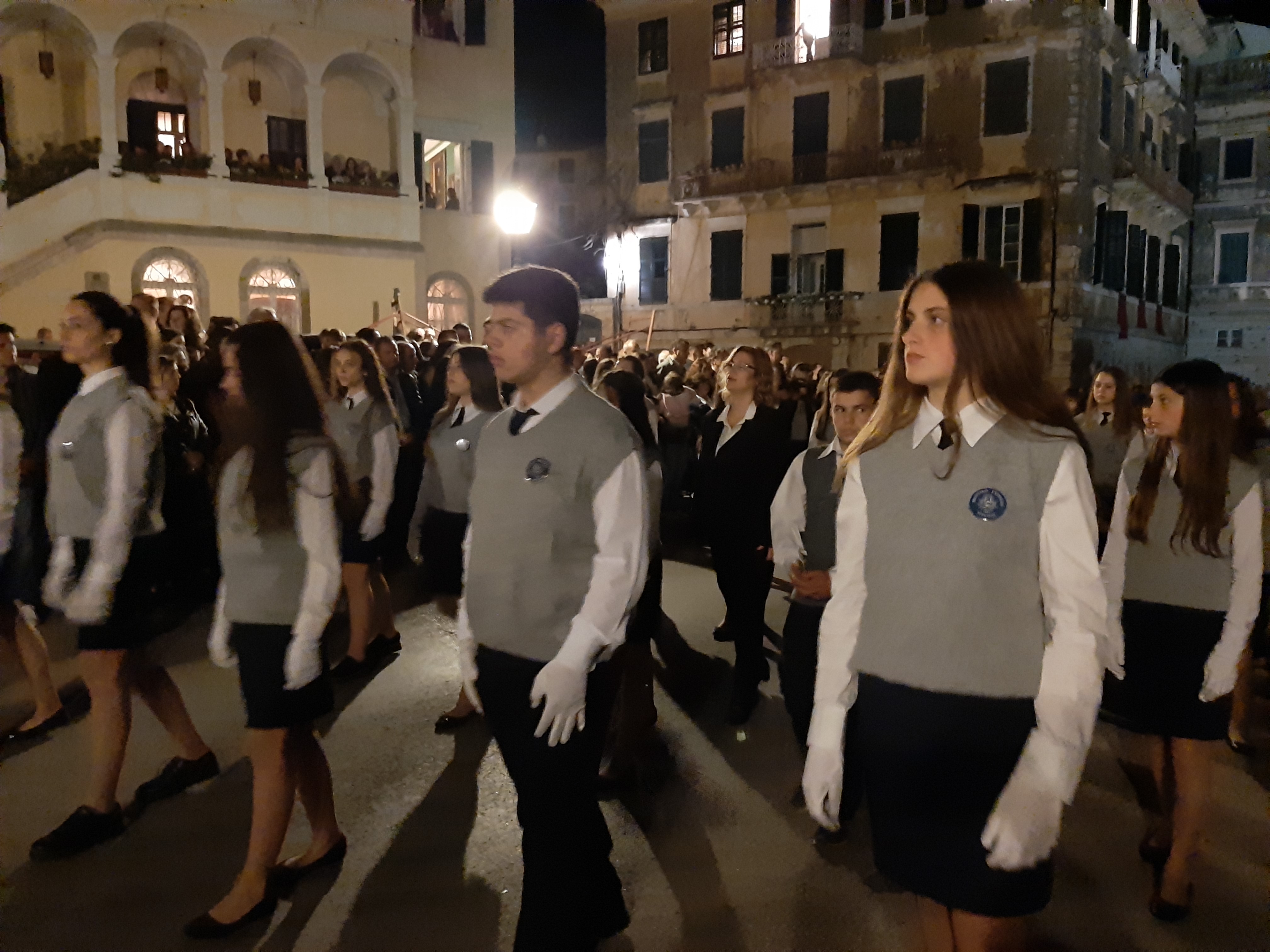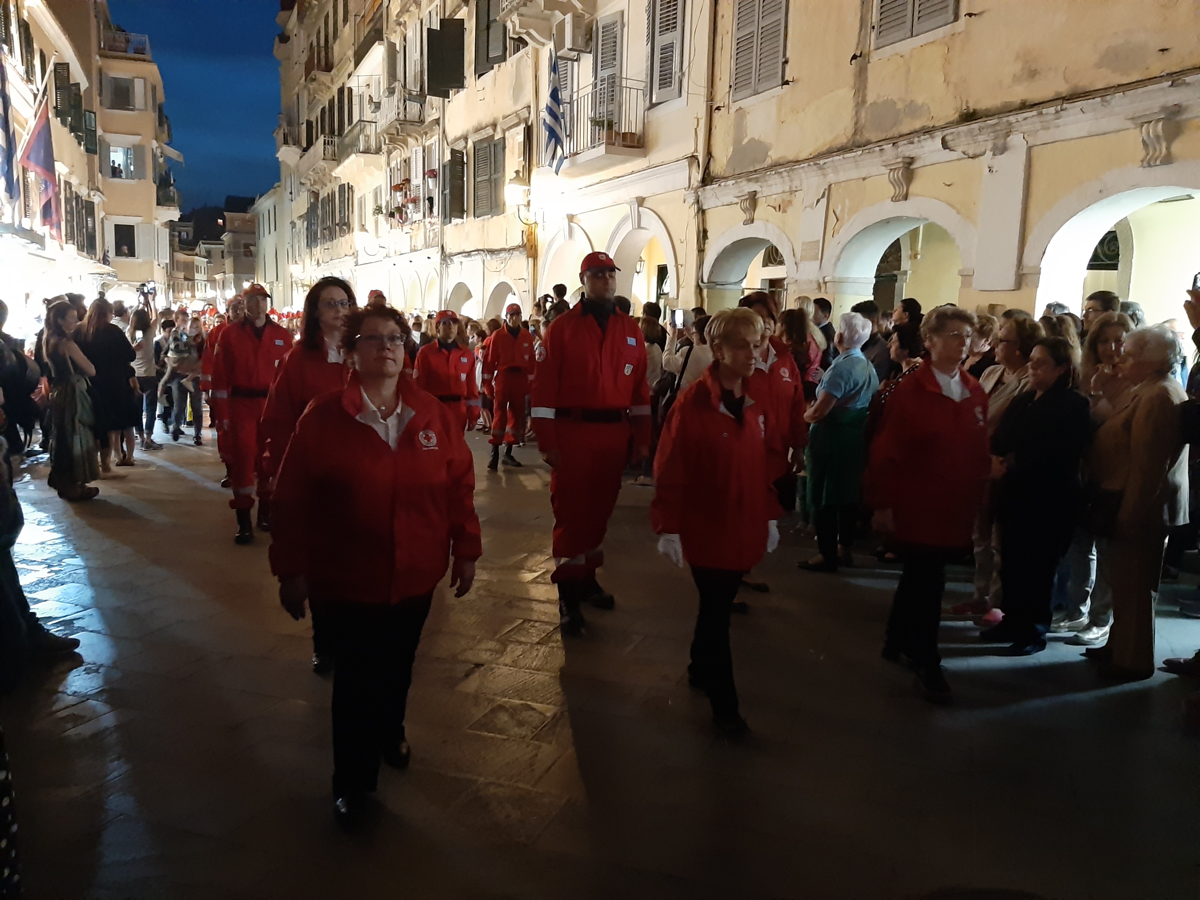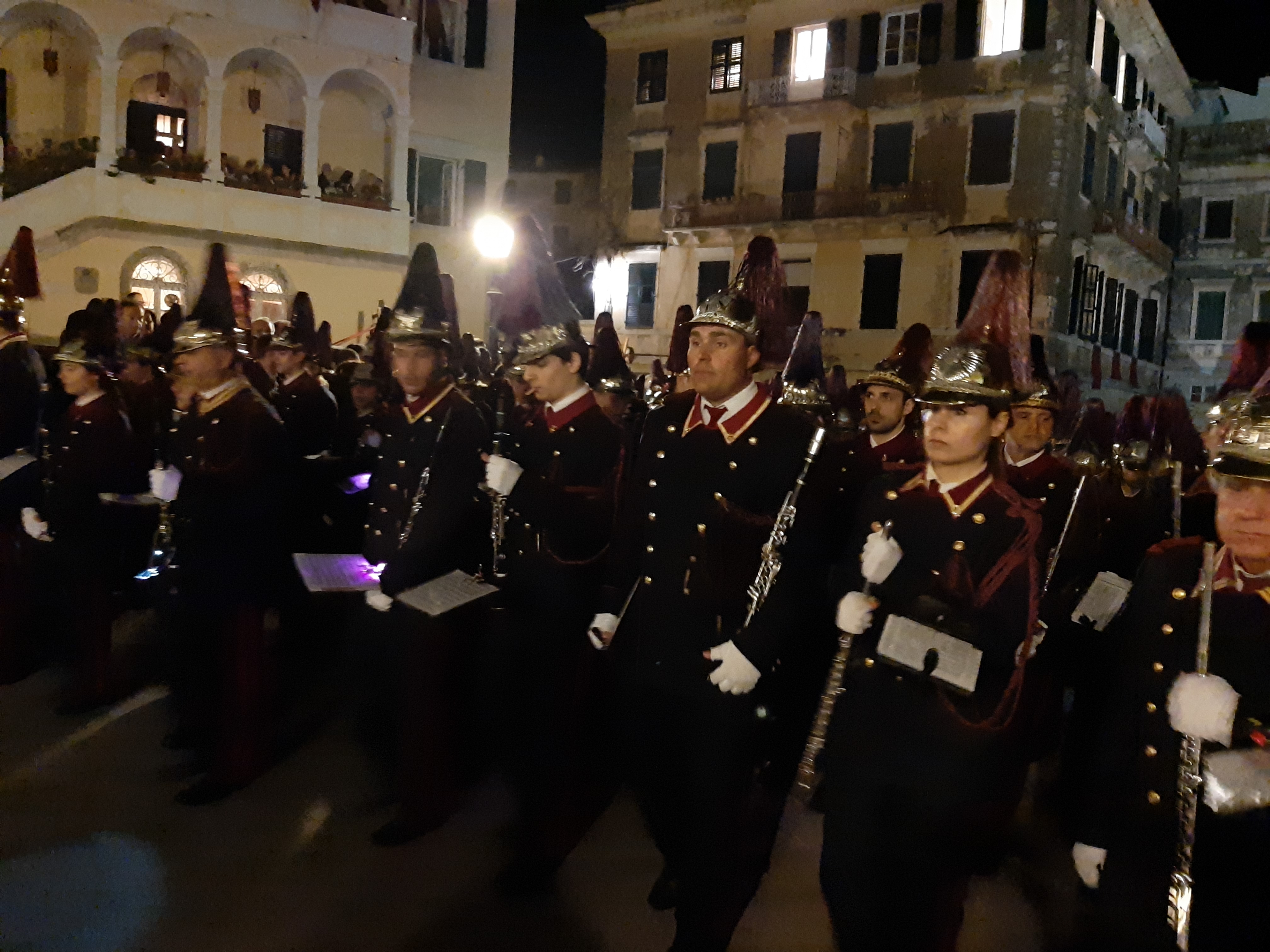 Η ώρα του μοναδικού θεάματος της πομπής των επιταφίων είχε φτάσει. Οι επιτάφιοι από τις διάφορες ενορίες της πόλης κατευθύνονται με πομπές, συνοδεία των φιλαρμονικών, προς τη Λιστόν. Ανάμεσά τους και η πομπή του επιταφίου του «διαφορετικού» καθολικού ναού που συνεορτάζει το Πάσχα στην Κέρκυρα μαζί με τους Ορθόδοξος. Μετά τις 10 μ.μ. σύσσωμες οι τρεις φιλαρμονικές σε παράταξη, με τα γυαλιστερά τους κράνη για να ξεχωρίζουν μαζί με ανδρικές και γυναικείες χορωδίες, ψέλνουν τα εγκώμια, ενώ στο μεγαλοπρεπές σκηνικό προσθέστε παρατεταγμένους μαθητές από όλα τα σχολεία της πόλης και αντιπροσωπείες κοινωνικών φορέων σε ένα εντυπωσιακό θέαμα που κρατά μέχρι και μετά τα μεσάνυχτα! Ευχαριστημένοι και πραγματικά άκρως εντυπωσιασμένοι από τα δρώμενα της Μεγάλης Παρασκευής, αλλά και κουρασμένοι από τις δραστηριότητες της ημέρας, γυρίσαμε στο ξενοδοχείο μας.