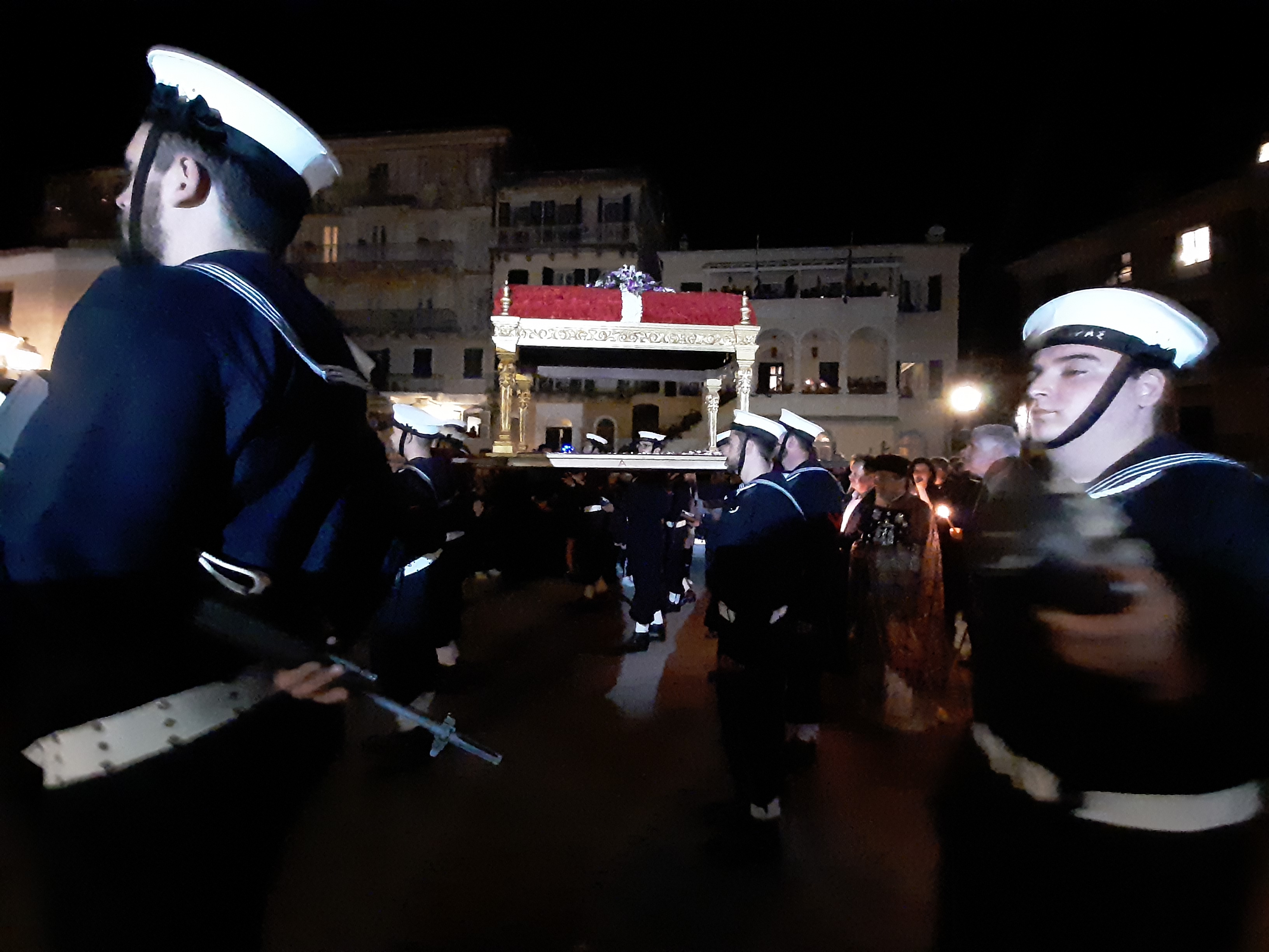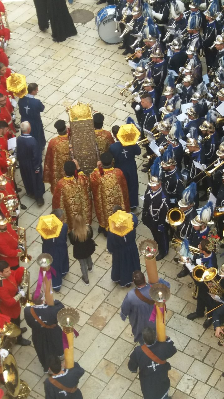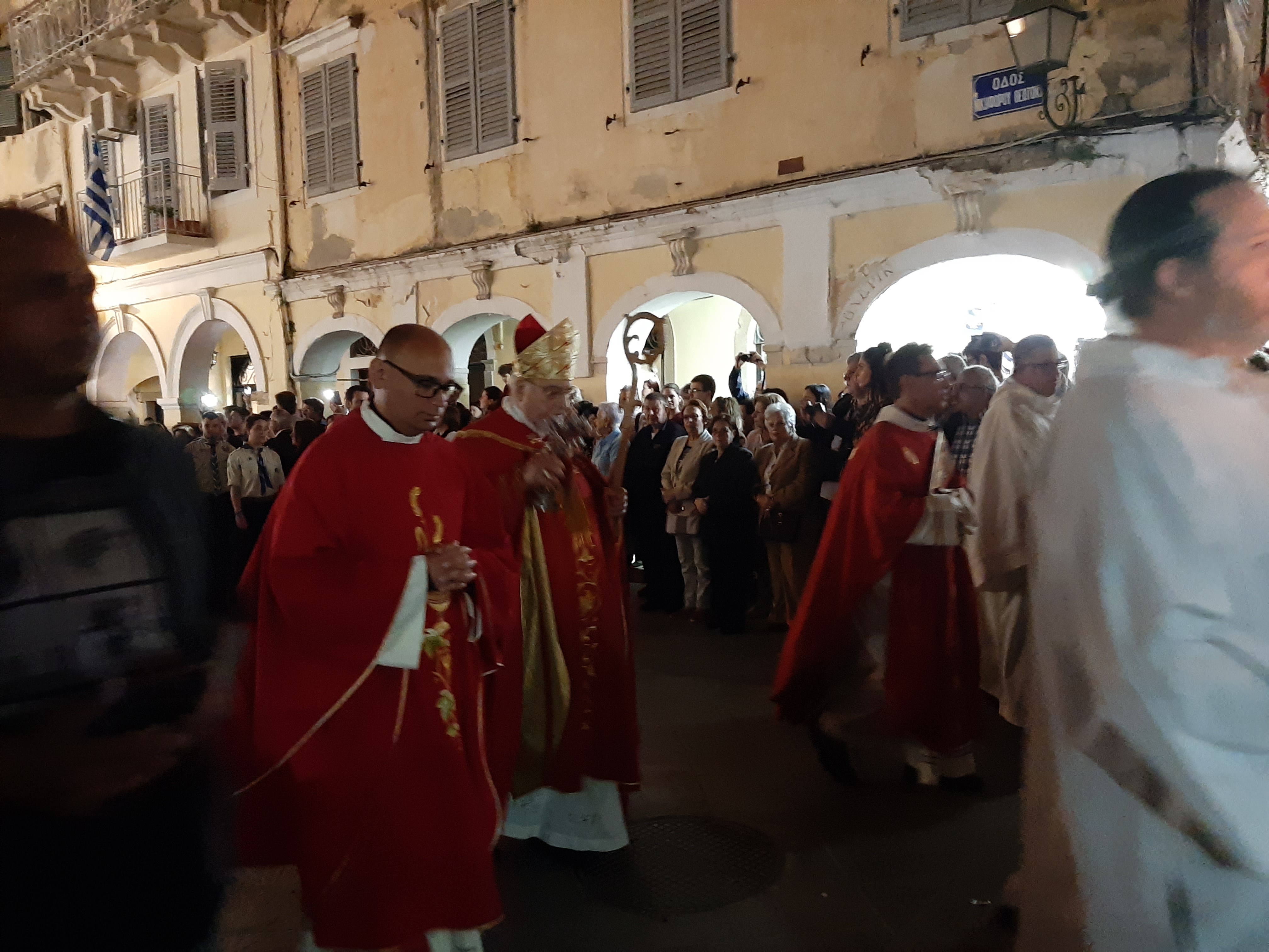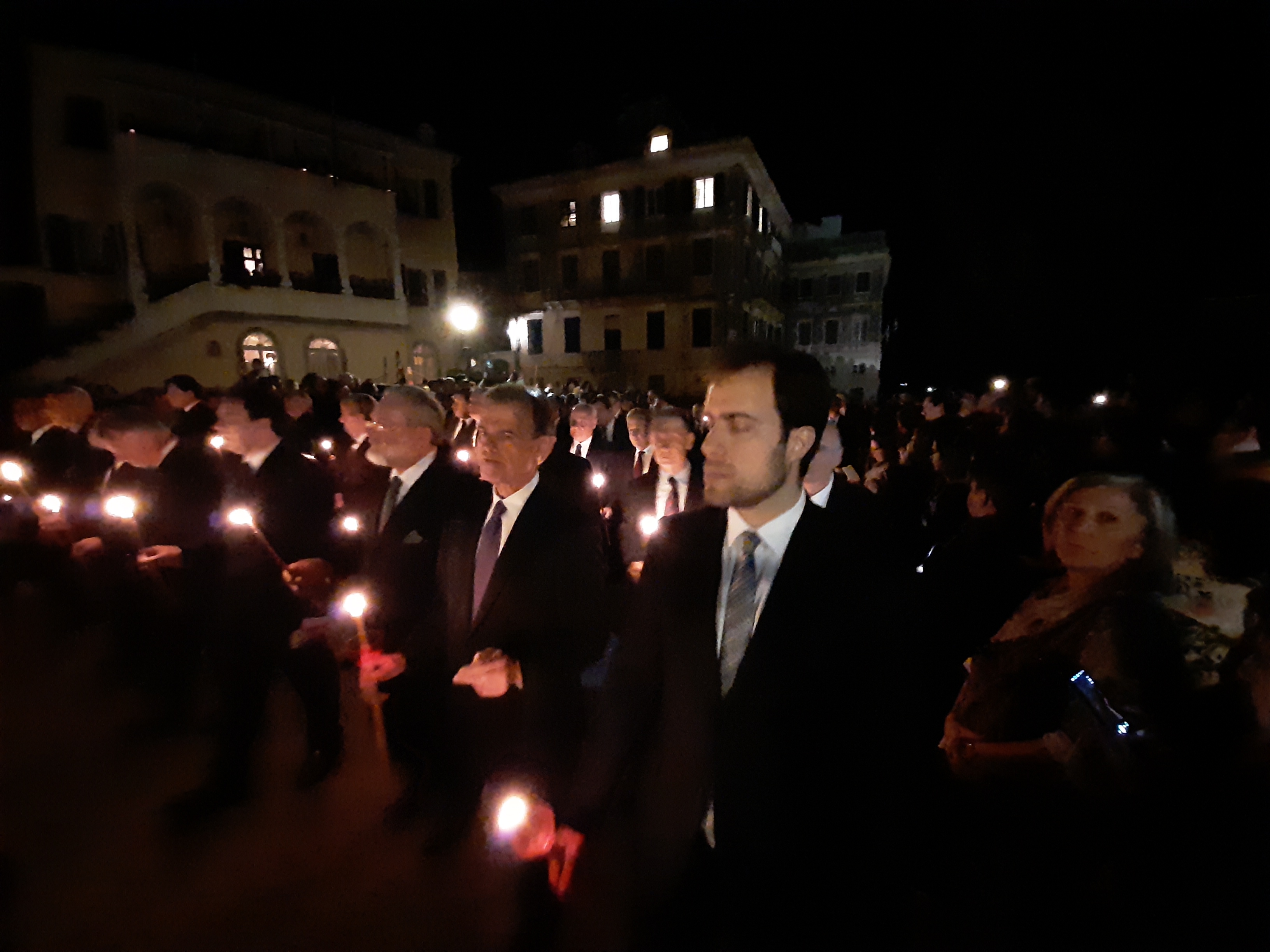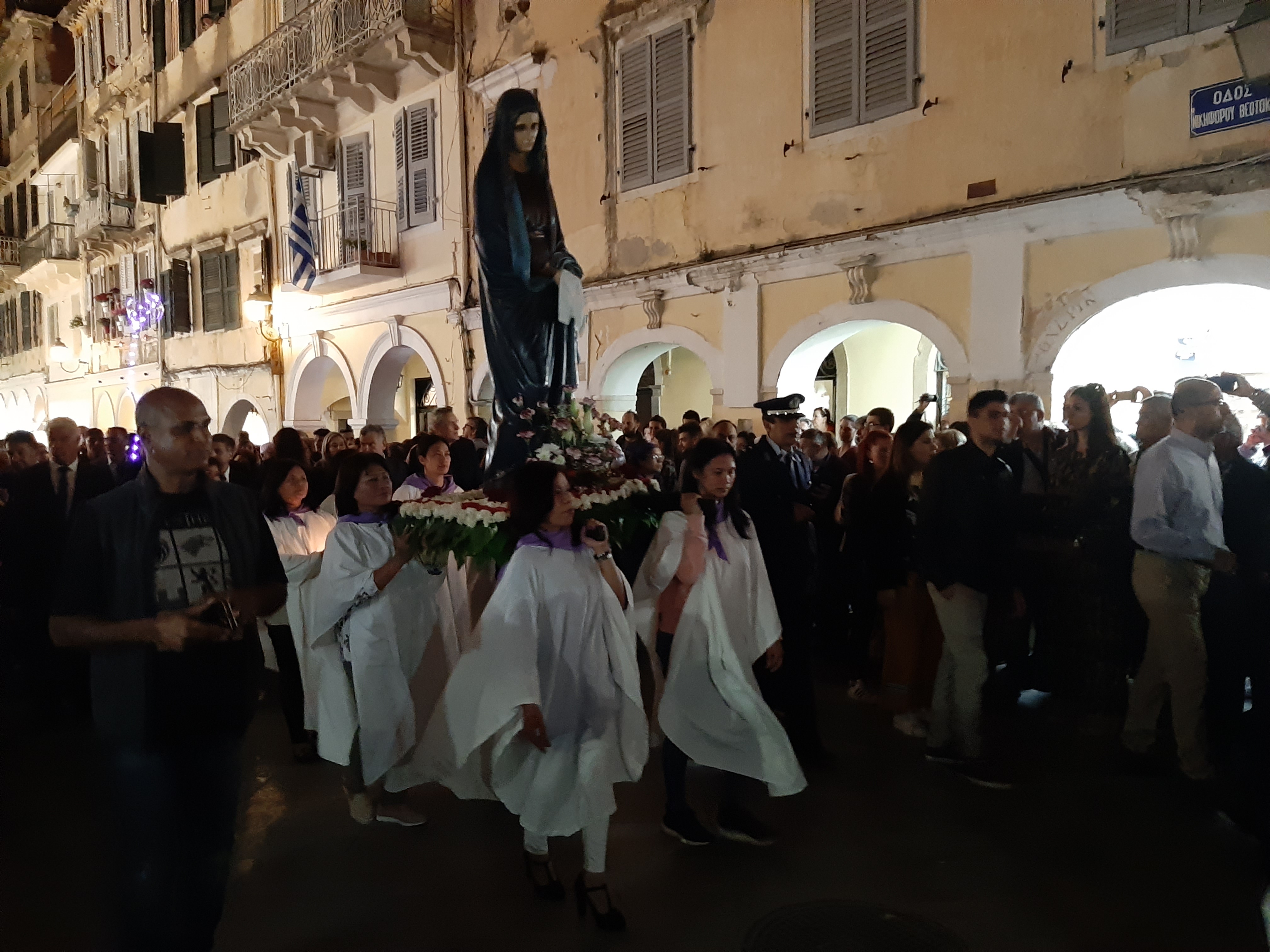Η ώρα του μοναδικού θεάματος της πομπής των επιταφίων είχε φτάσει. Οι επιτάφιοι από τις διάφορες ενορίες της πόλης κατευθύνονται με πομπές, συνοδεία των φιλαρμονικών, προς τη Λιστόν. Ανάμεσά τους και η πομπή του επιταφίου του «διαφορετικού» καθολικού ναού που συνεορτάζει το Πάσχα στην Κέρκυρα μαζί με τους Ορθόδοξος. Μετά τις 10 μ.μ. σύσσωμες οι τρεις φιλαρμονικές σε παράταξη, με τα γυαλιστερά τους κράνη για να ξεχωρίζουν μαζί με ανδρικές και γυναικείες χορωδίες, ψέλνουν τα εγκώμια, ενώ στο μεγαλοπρεπές σκηνικό προσθέστε παρατεταγμένους μαθητές από όλα τα σχολεία της πόλης και αντιπροσωπείες κοινωνικών φορέων σε ένα εντυπωσιακό θέαμα που κρατά μέχρι και μετά τα μεσάνυχτα! Ευχαριστημένοι και πραγματικά άκρως εντυπωσιασμένοι από τα δρώμενα της Μεγάλης Παρασκευής, αλλά και κουρασμένοι από τις δραστηριότητες της ημέρας, γυρίσαμε στο ξενοδοχείο μας.