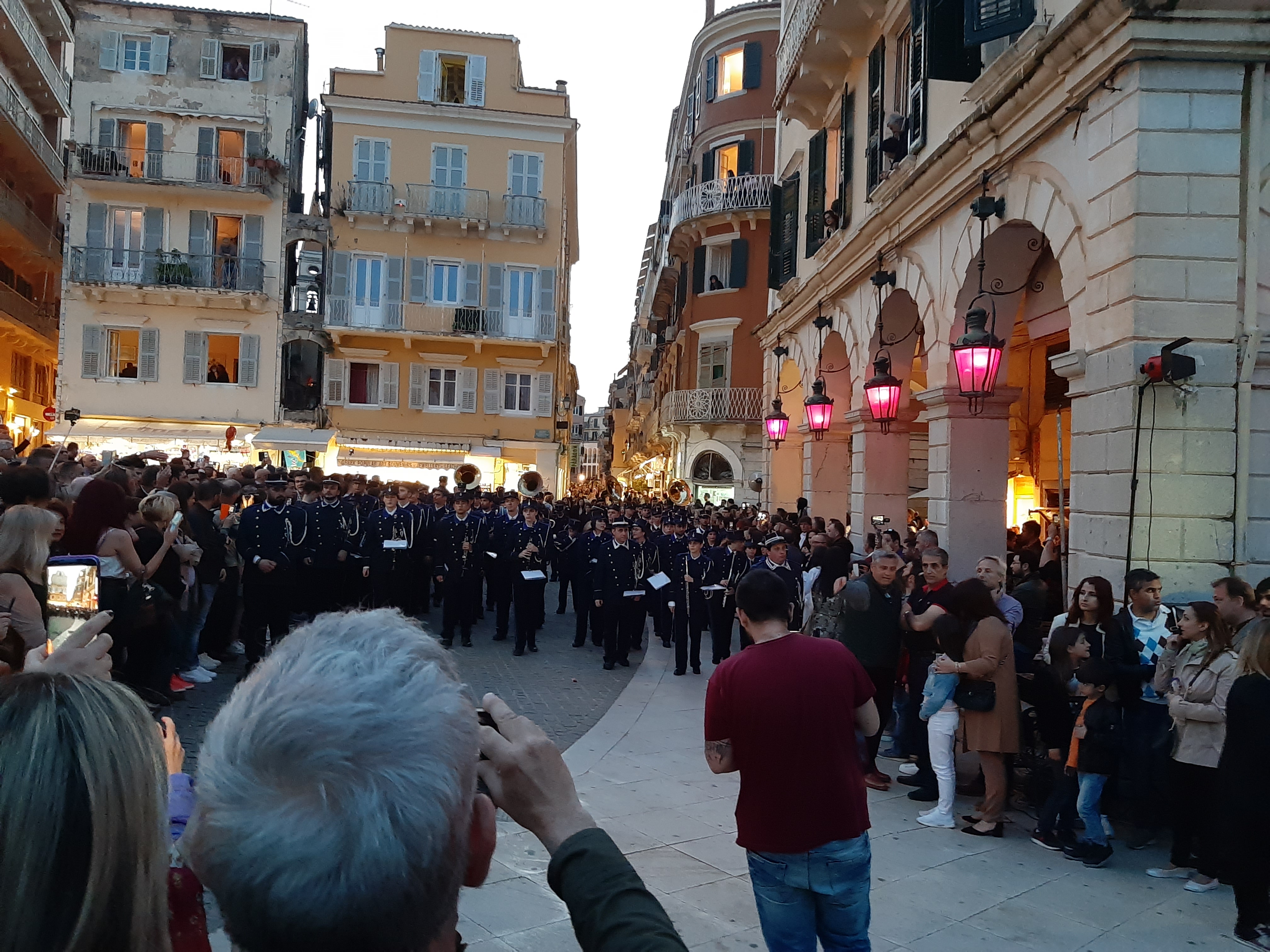 Στη συνέχεια ο συνάδελφος Λαμάκιας που έχει βαθιά γνώση των πολιτιστικών της Κέρκυρας μιας και έχει ο ίδιος ενεργή συμμετοχή, μας εξήγησε για τις τρεις φιλαρμονικές της Κέρκυρας – την Παλαιά, Καποδίστρια, Μάντζαρος – που παρά τις οικονομικές δυσκολίες συνεχίζουν να συντηρούνται με τεράστιες προσπάθειες από τους ανθρώπους του νησιού που έχει τεράστια πολιτιστική και μουσική παράδοση, να διατηρούν ένα εξαιρετικά υψηλό επίπεδο λόγω του πολύ αυστηρού πλαισίου λειτουργίας τους, αλλά και να… κονταροχτυπιούνται αφού η αντιπαλότητά τους αναμένει αναλλοίωτη με το πέρασμα των χρόνων! Μάλιστα, όπως μας εξήγησε ο συνάδελφος, θεωρείται αδιανόητο ένα μέλος της μίας φιλαρμονικής ορχήστρας να «πάρει μεταγραφή» για την άλλη! Ωστόσο εμάς σαν εξωτερικούς παρατηρητές δε μας επηρεάζουν αυτά και αντίθετα μας απέμενε να απολαύσουμε και τις τρεις φιλαρμονικές που έχουν όλες διακριθεί με μεγάλα διεθνή βραβεία και, όπως διαπιστώσαμε αργότερα, δίνουν πράγματι ένα καταπληκτικό μουσικό χρώμα σε όλες τις πασχαλινές εκδηλώσεις της Κέρκυρας!