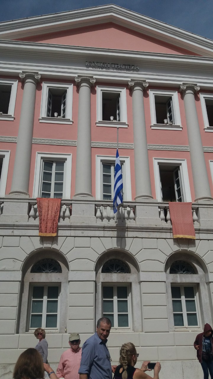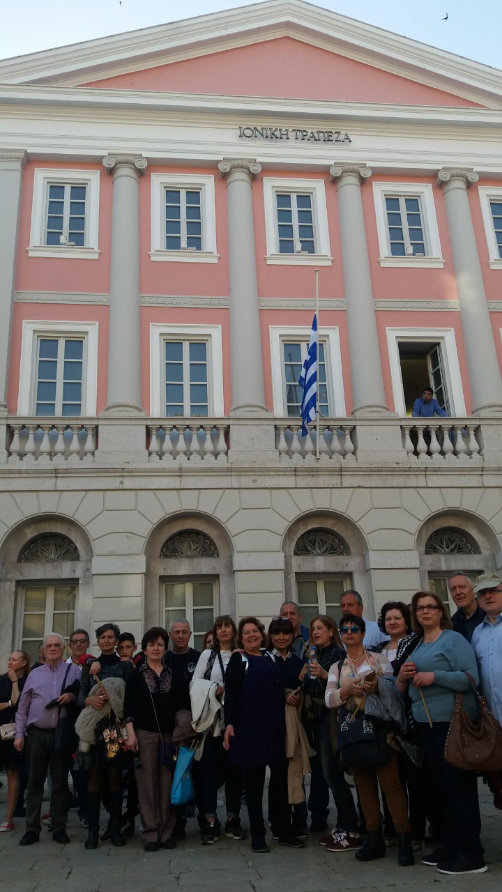 Οι συνάδελφοί μας Λαμάκιας και Καραμπίκας μας πληροφόρησαν για τη μεγαλύτερη πλατεία των Βαλκανίων, την ξακουστή Σπιανάδα, που αποτελεί πόλο έλξης τουριστών από όλο τον κόσμο, αλλά και παραδοσιακό τόπο συγκέντρωσης των Κερκυραίων. Κάναμε μία μικρή βόλτα που δε θα μπορούσε να μην περάσει από το σημείο που «μαγνήτιζε» το ενδιαφέρον μας ως Ιονικάριοι… Επισκεφθήκαμε στην καρδιά της πόλης το αρχαιότερο κτίριο της πρώτης ελληνικής τράπεζας, της δικιάς μας Ιονικής Τράπεζας, το οποίο είναι και το μοναδικό που φέρει σήμερα την επιγραφή της Ιονικής Τράπεζας και λειτουργεί πλέον ως Νομισματικό Μουσείο -καθότι η Ιονική ήταν η πρώτη ελληνική εκδοτική τράπεζα και μάλιστα διατήρησε το εκδοτικό προνόμιο επί σειρά ετών.