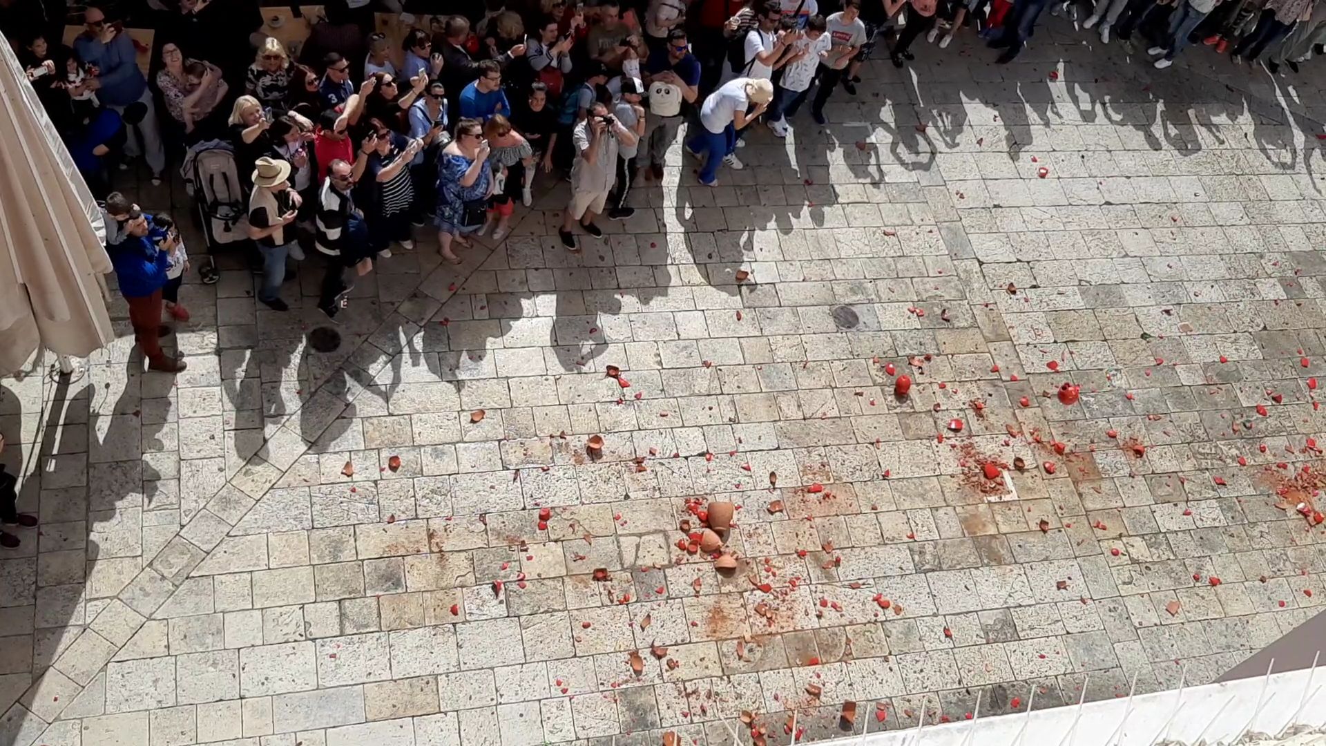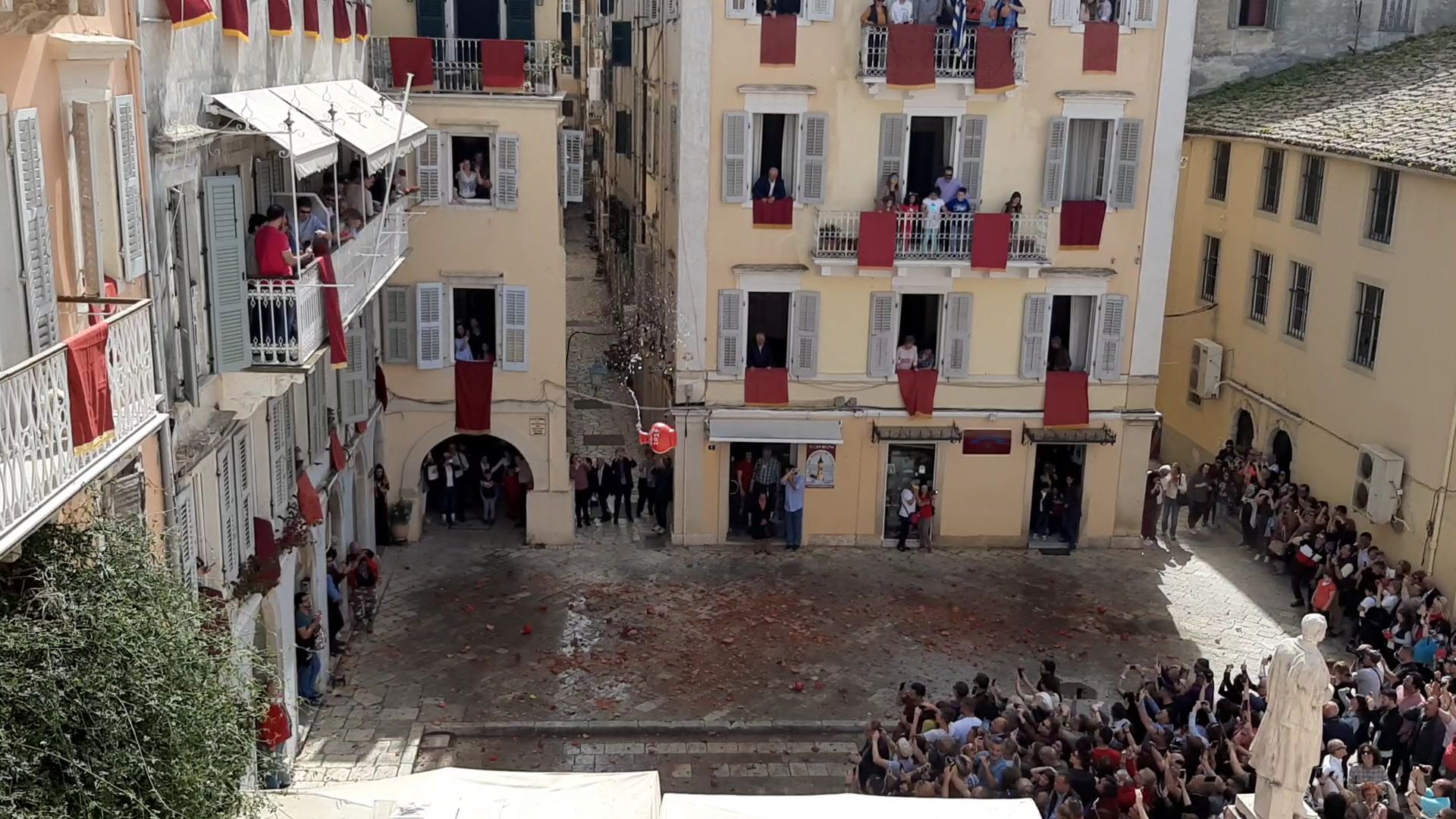 Το Μεγάλο Σάββατο μας επεφύλασσε και άλλες πολύ όμορφες εκδηλώσεις και βεβαίως περιλάμβανε το πιο γνωστό έθιμο του κερκυραϊκού Πάσχα με τη ρίψη των κανατιών. Επειδή όμως η πρώτη Ανάσταση και το ξεχωριστό θέαμα των κανατιών προσελκύει πιστούς από όλη την Ελλάδα με αποτέλεσμα να επικρατεί το… αδιαχώρητο, πολύ νωρίς το πρωί μετά το πρωινό μας επιβιβαστήκαμε στο λεωφορείο για να προλάβουμε να μπούμε στην πόλη πριν επικρατήσει το αδιαχώρητο, προκειμένου να φτάσουμε στο κτίριο της τράπεζας της καρδιάς μας που βρίσκεται στο επίκεντρο των εκδηλώσεων, από όπου θα τις παρακολουθούσαμε προσκεκλημένοι των Κερκυραίων συναδέλφων μας. Πράγματι, διασχίσαμε τη σημαιοστολισμένη προς τιμήν του Αγίου Σπυρίδωνα με τα πορφυρά επονομαζόμενα δαμάσκο (επειδή τα υφάσματα αυτά έρχονταν αρχικά από τη Δαμασκό) πόλη φτάνοντας στο κτίριο της Ιονικής και από τα παράθυρα και τα μπαλκόνια είχαμε την ευκαιρία να ζήσουμε, χωρίς να ταλαιπωρηθούμε, τόσο τη λιτανεία του Αγίου Σπυρίδωνα -το Μεγάλο Σάββατο είναι η μοναδική μέρα που περιφέρεται όρθιο το σκήνωμα του Αγίου συνοδεία των φιλαρμονικών – όσο και εν συνεχεία στις 11 π.μ. υπό τον ήχο των καμπανών του Αγίου Σπυρίδωνα -που είναι ακριβώς δίπλα στο πρώην κτίριο της Ιονικής- τη λεγόμενη πρώτη Ανάσταση που σηματοδοτεί και την εκκίνηση του πασίγνωστου εθίμου των μπότηδων, όπου οι ντόπιοι πετούν τις στάμνες από τα μπαλκόνια. Ο συνάδελφος Λαμάκιας μάλιστα είχε φροντίσει να προμηθευτεί στάμνες και έτσι συμμετείχαμε κι εμείς στο έθιμο! Αφού μαζέψαμε για γούρι και ενθύμιο ένα κομματάκι από τα… σπασμένα, περπατήσαμε στους χώρους του Μουσείου και εν συνεχεία κατεβήκαμε όλοι μαζί στους κατάμεστους δρόμους, όπου πλέον οι μπάντες παιάνιζαν χαρούμενη μουσική.
